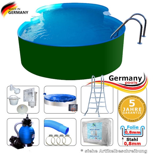 Modell = "Lima-Edition"Mantelfarbe = "Grün" Achtform-Stahlwandpool -Komplettset mit Zubehör inkl. wie Sandfilteranlage mit Filtersand, Anschlussset, Edelstahlleiter, Abdeckplane, Bodenschutzvlies, Einbauskimmer und Einlaufdüse uvm.